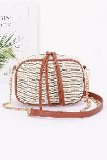 Add effortless charm to your wardrobe with the Chic Canvas Charm, a stylish crossbody bag that beautifully balances functionality and elegance. Crafted from soft beige canvas with premium polyurethane accents and mixed metal details, this bag features a striking gold chain strap for a touch of sophistication. Its compact bowling bag silhouette offers just the right amount of space for your essentials, making it perfect for both everyday wear and special outings. Lightweight and versatile, the Chic Canvas Charm elevates any look with ease.