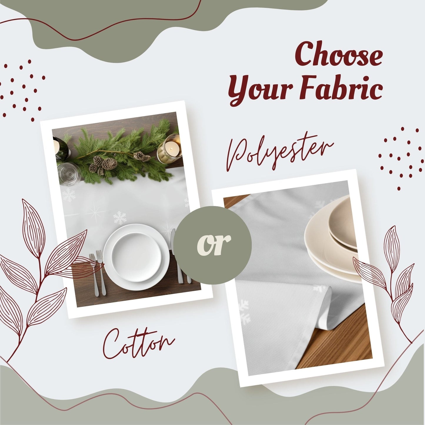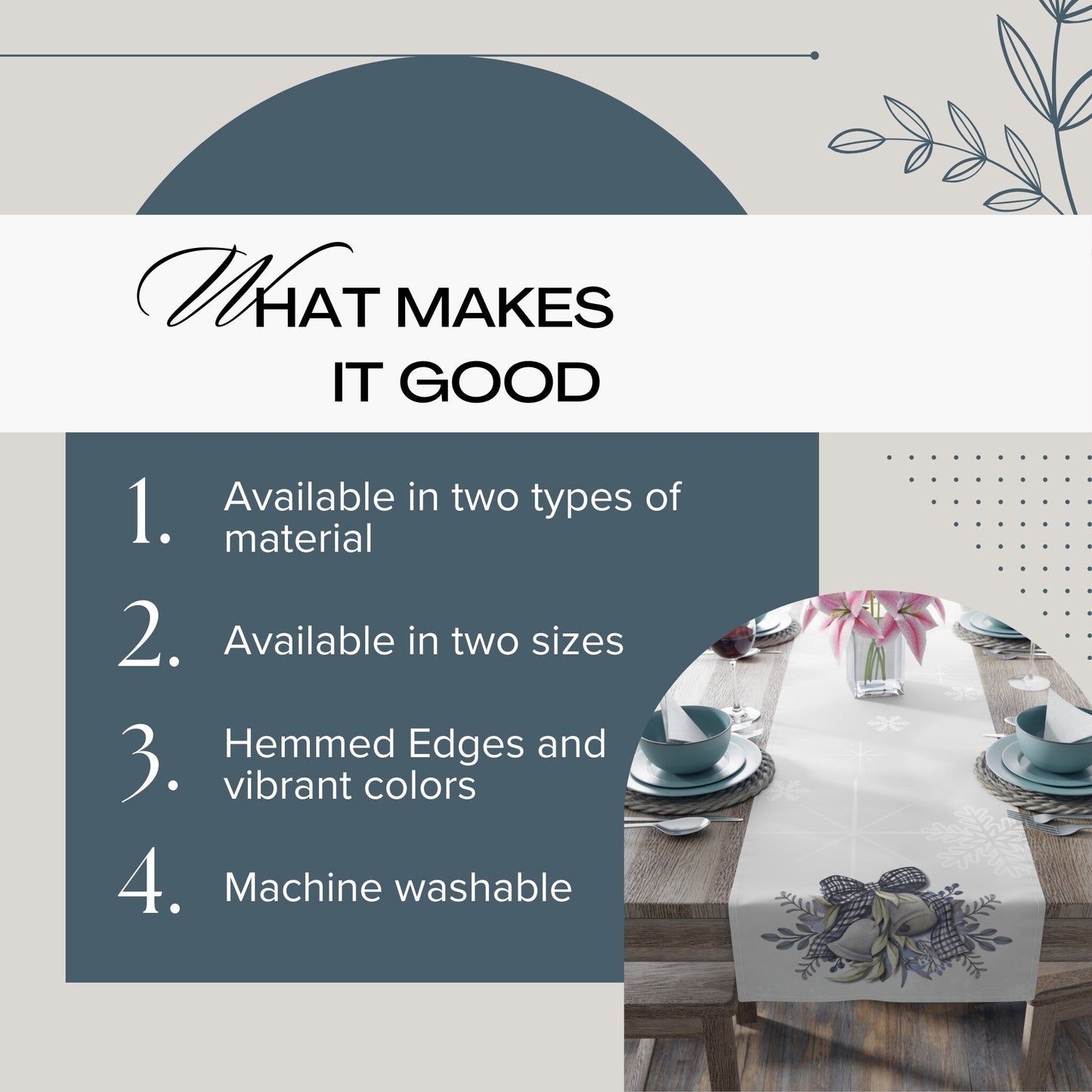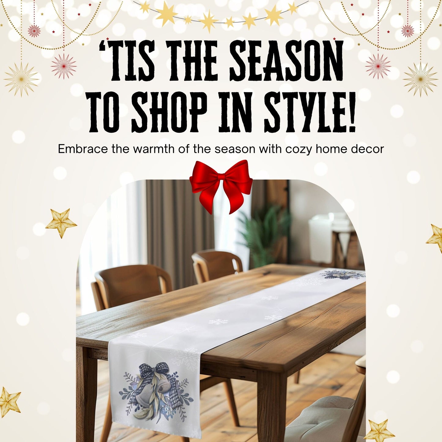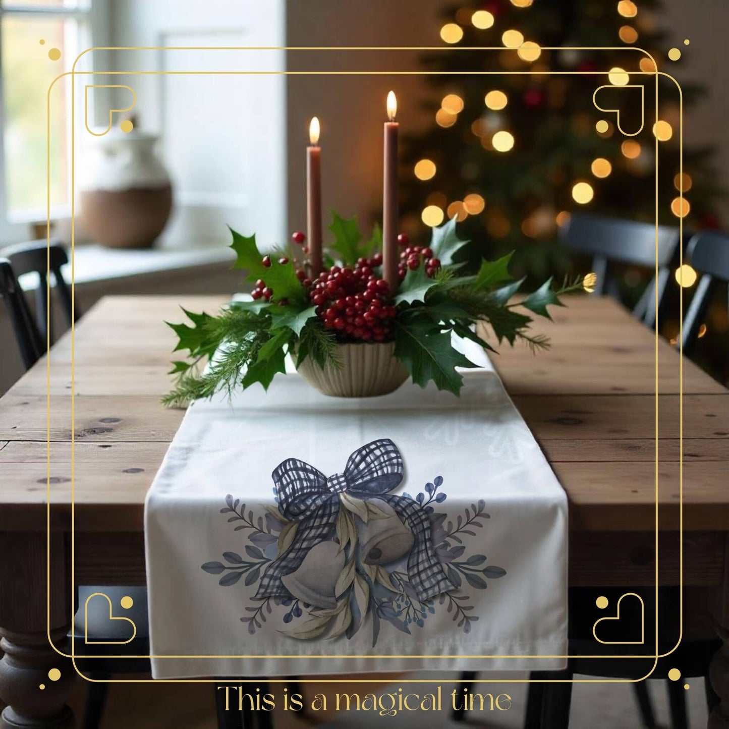 Transform your dining experience this holiday season with the Elegant Bells Table Runner. Featuring a beautiful blend of silver bells, delicate blue ribbons, and charming white snowflakes, this table runner adds a touch of winter wonder to any setting. Perfect for holiday gatherings, winter weddings, or festive dinners, it effortlessly enhances your table decor with its elegant design and seasonal charm. Crafted from high-quality cotton twill or durable polyester, this table runner is available in two sizes—16x72 inches and 16x90 inches—making it a versatile addition to your holiday table. The machine-washable fabric offers convenience, while the hemmed and sewn edges ensure durability for long-lasting use. With its quick-dry features, you can easily maintain its stylish look throughout the season. Elevate your table decor with the Elegant Bells Table Runner, a perfect blend of functionality and festive elegance that will leave your guests in awe. Bring home this seasonal table linen and create memories that will last a lifetime!