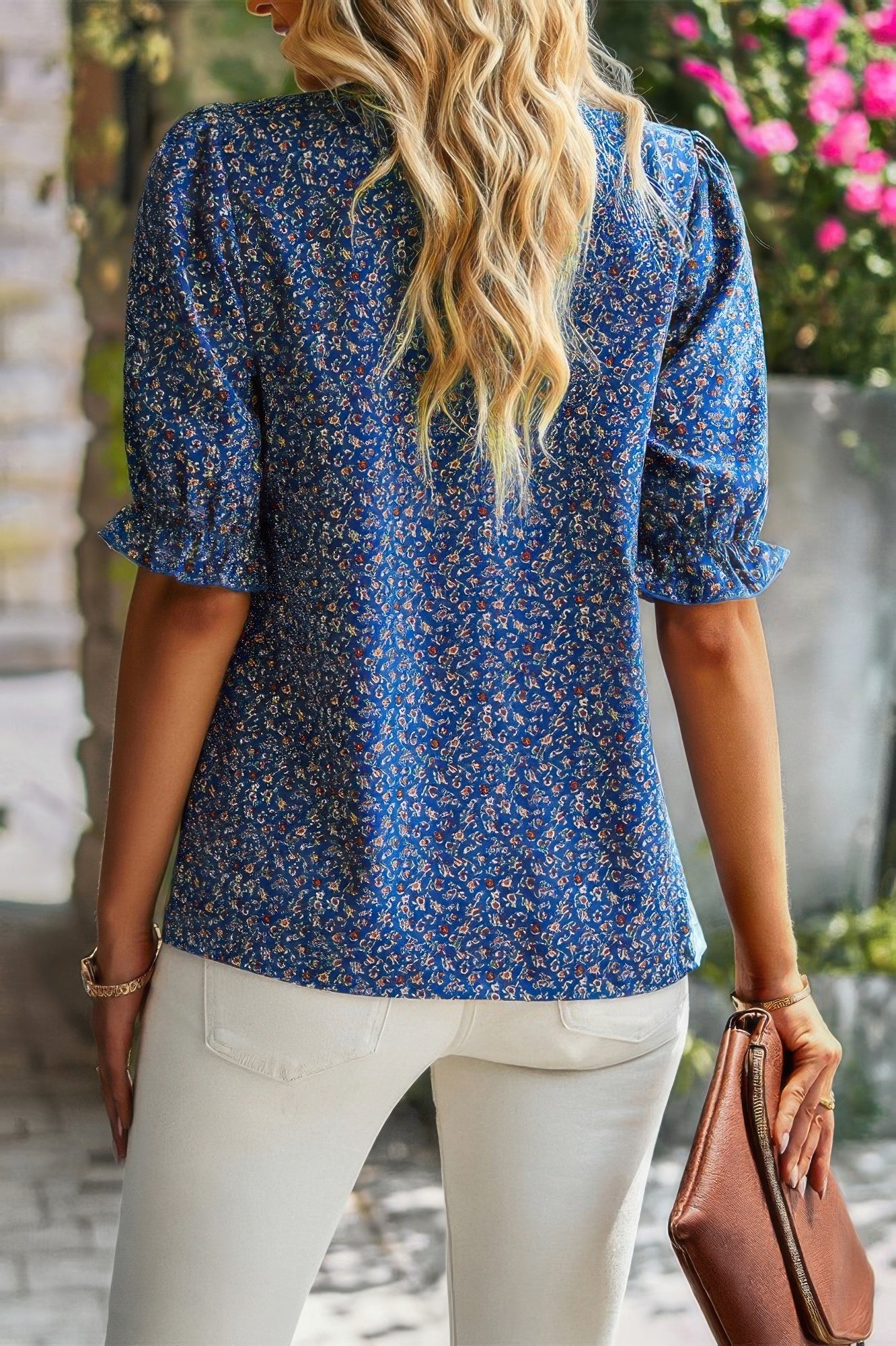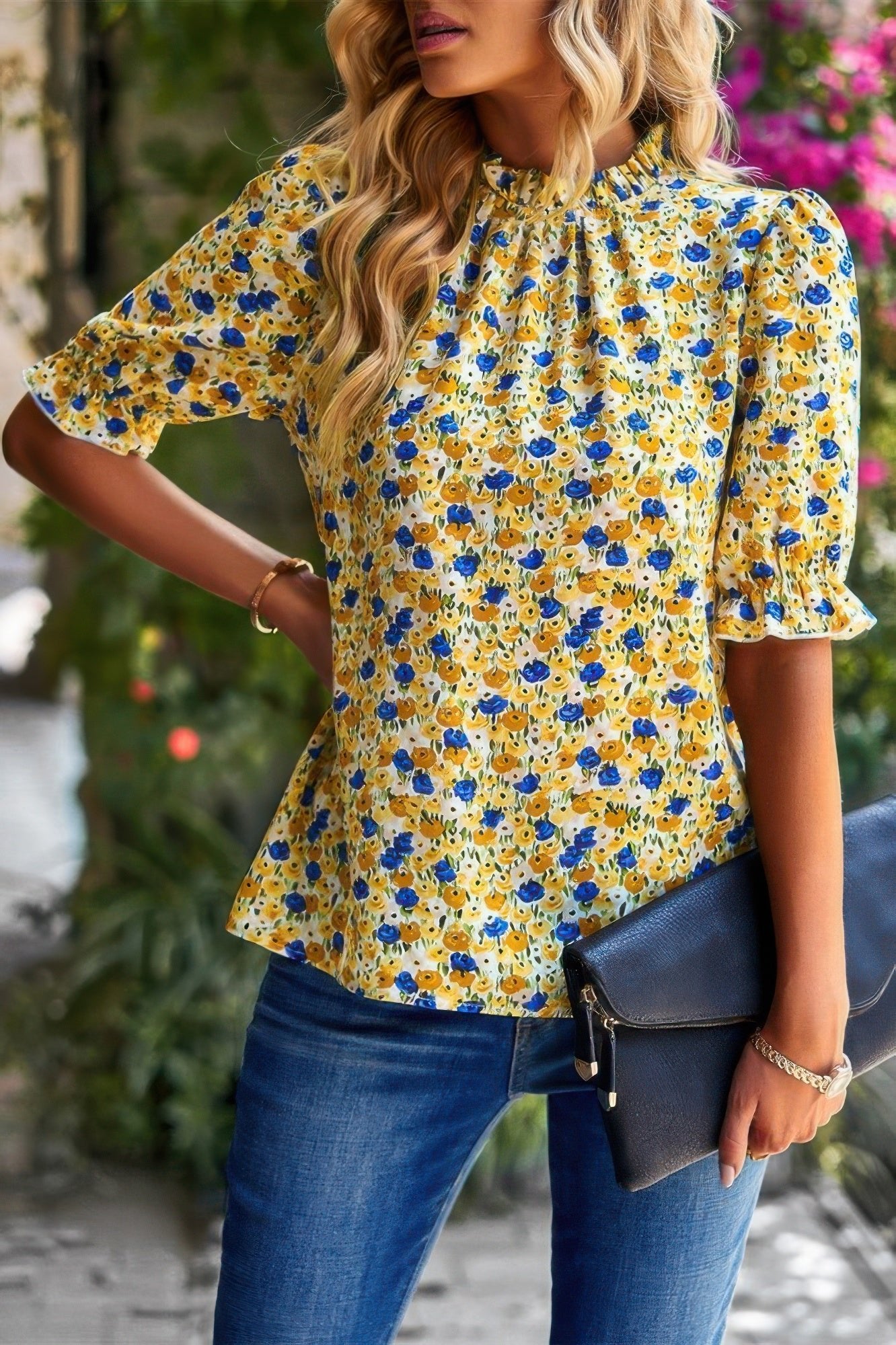 Floral Ruffle Mock Neck Puff Short Sleeve Shirt