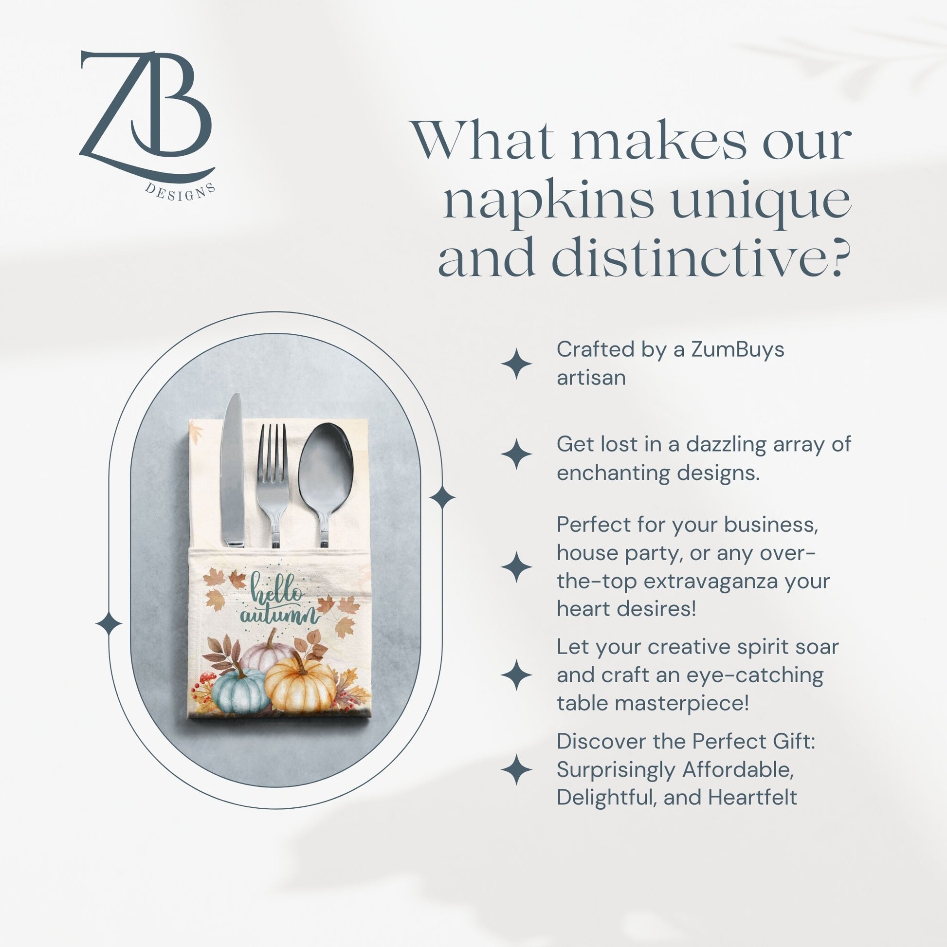 Embrace the cozy spirit of the season with our Hello Autumn Cloth Napkin Set. This exquisite set of four features a charming blend of blue, mauve, and orange pumpkins adorned with delicate fall leaves, making it the perfect addition to your autumn table décor. Whether you're preparing for a festive Thanksgiving dinner or simply wishing to enhance your seasonal gatherings, these napkins effortlessly elevate your table setting. Crafted from luxurious and durable polyester, each napkin offers a soft touch that your guests will appreciate. Measuring 20x20 inches, they provide ample coverage for your dining experience while adding a stylish flair. Easy to care for, this set is machine washable and dries quickly, ensuring you’ll have a fabulous, fresh look at every meal. Celebrate the beauty of fall with our Hello Autumn Napkin Set—the ideal choice for any autumn occasion. Experience the warmth of the season and delight your guests with elegant pumpkin décor that complements your thanksgiving feast perfectly!