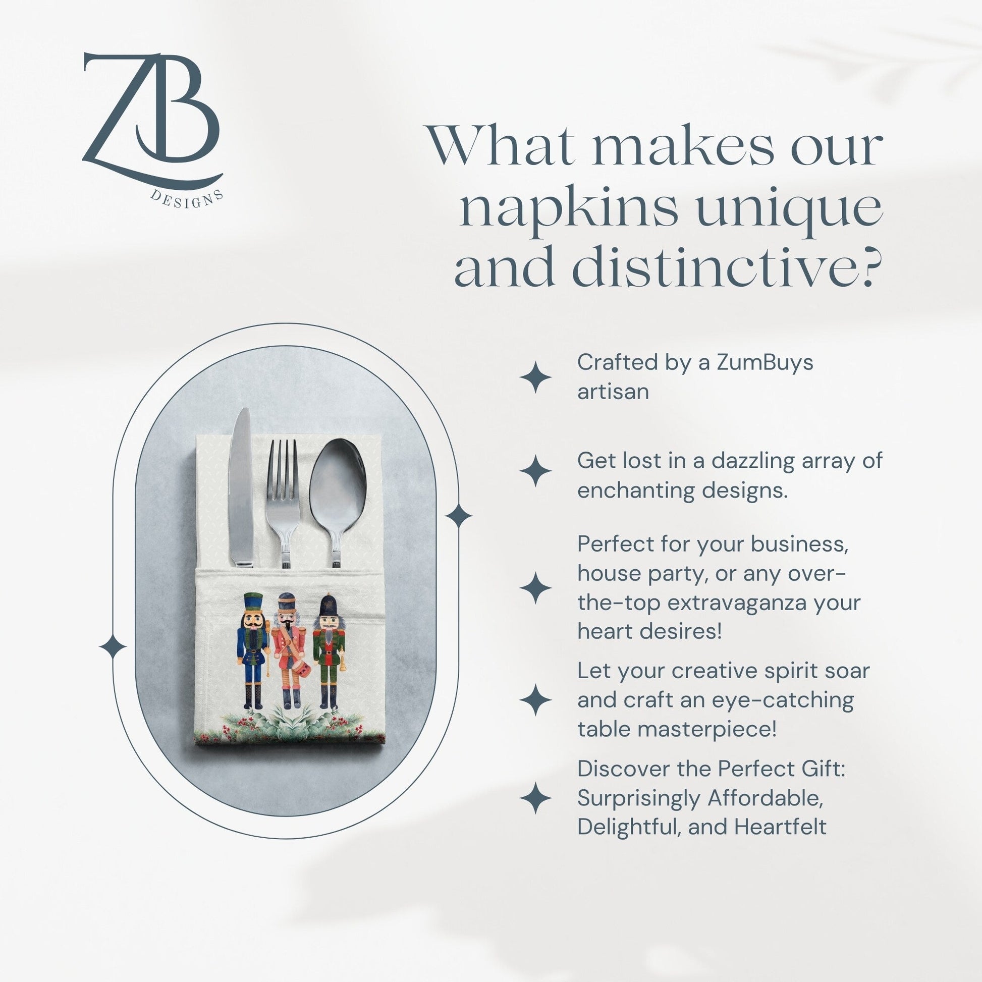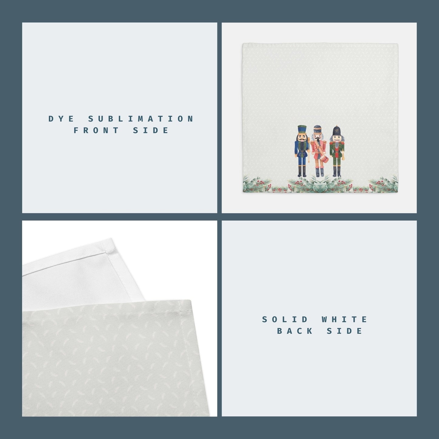 Transform your holiday dining experience with the Holiday Nutcracker Cloth Napkin Set. This exquisite set includes four beautifully designed napkins adorned with charming nutcracker soldiers and festive garlands in a rich green hue, perfect for adding a touch of Christmas spirit to your table. Each napkin measures 20x20 inches, offering ample coverage for all your holiday gatherings. Crafted from luxurious and durable polyester, these napkins provide both elegance and functionality. The soft material ensures comfort while dining, and their high-quality fabric is designed to withstand the rigors of holiday celebrations. Plus, when the festivities are done, simply toss them in the washing machine for easy care—they dry quickly and remain vibrant, ready for your next seasonal occasion. Whether you're hosting a grand Christmas dinner or an intimate holiday brunch, the Holiday Nutcracker Cloth Napkin Set serves as the perfect decorative accent, reflecting the joy and warmth of the season. Elevate your table setting and impress your guests with this delightful combination of style and practicality. Ideal as a gift for nutcracker enthusiasts or for anyone looking to enhance their holiday table décor, this napkin set brings a festive flair to every gathering.