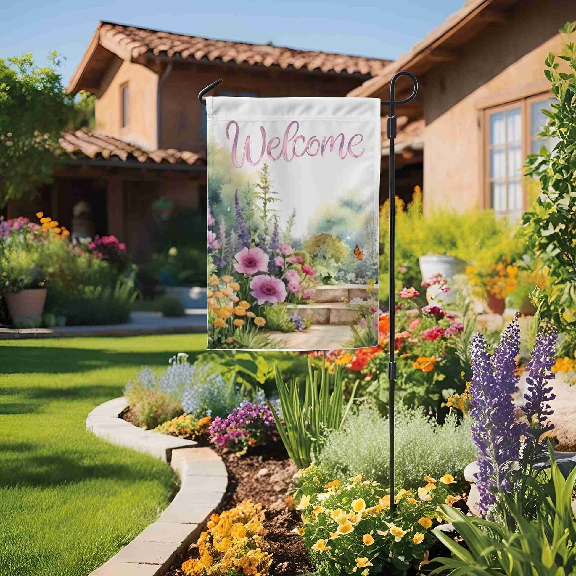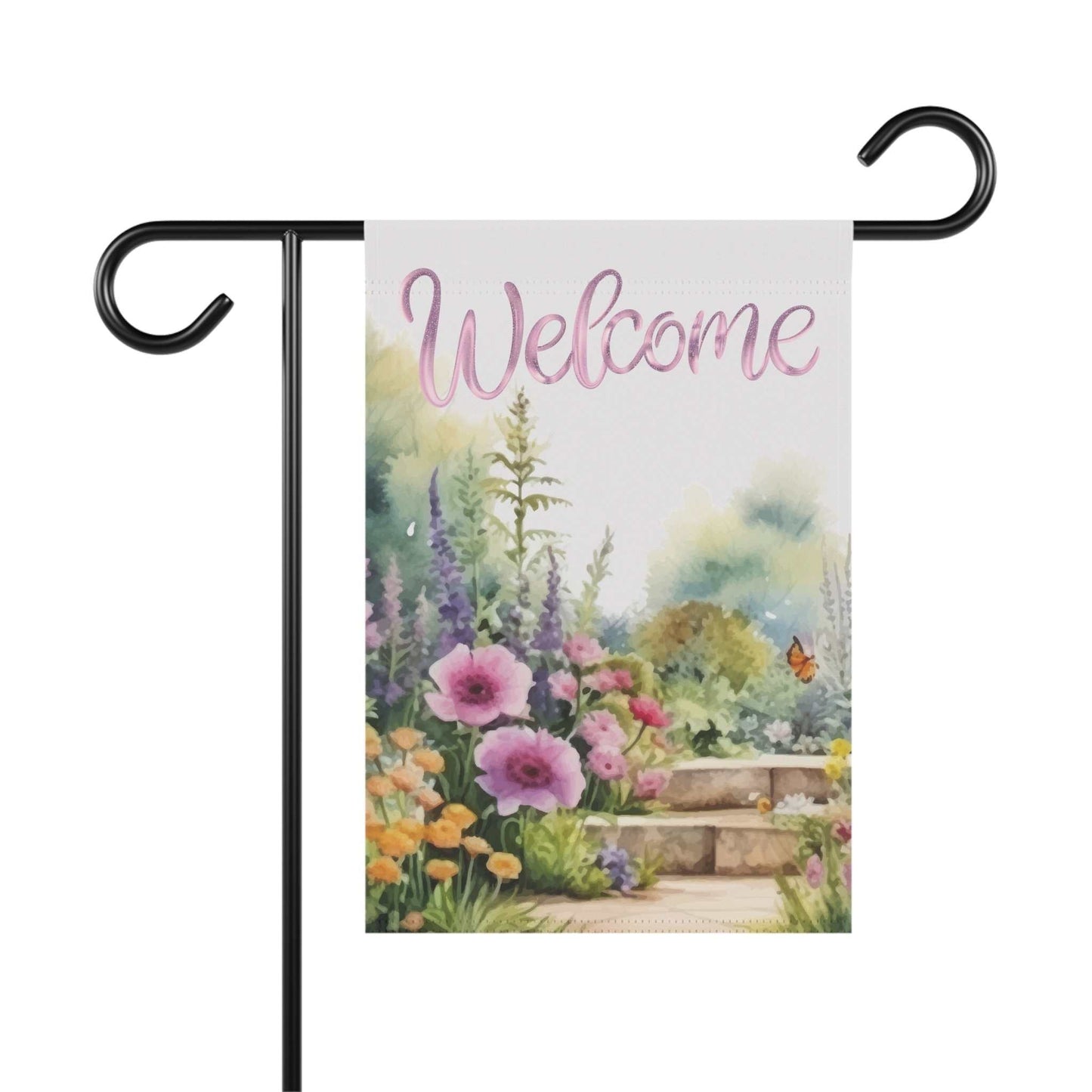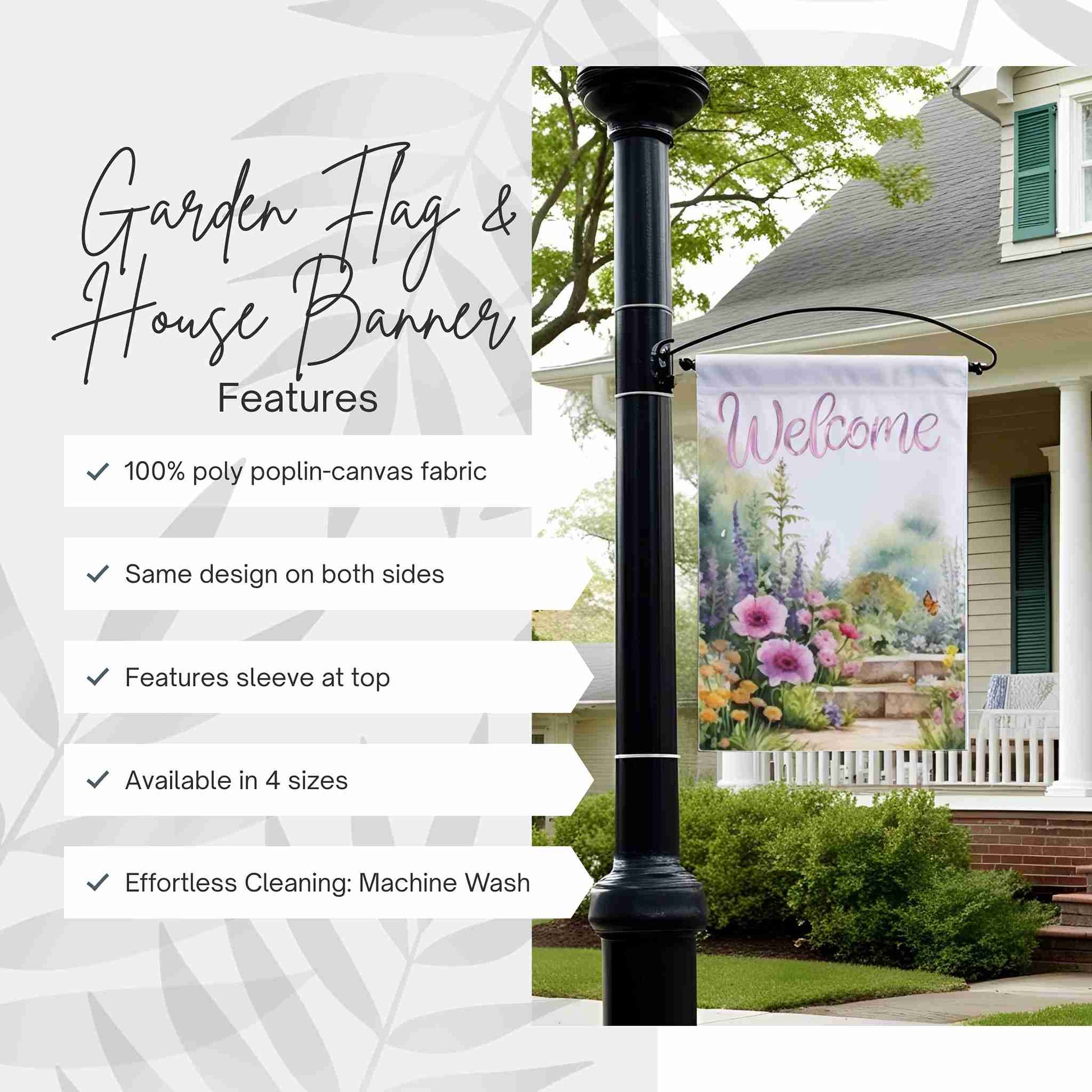 Welcome guests with the vibrant charm of the Petalscape Garden Banner or House Flag, a perfect addition to your spring and summer outdoor décor. Featuring a beautifully detailed floral garden design, this double-sided fabric banner adds a warm and inviting touch to your front porch, garden, or yard. Crafted from durable poly poplin-canvas fabric in an elegant off-white background, it’s designed to withstand the elements while maintaining its vivid colors season after season. Available in multiple sizes—12”x18”, 18.325”x27”, 24”x32”, and 24”x36”—this versatile floral banner fits most standard garden flag poles (stand or pole not included). The top pole slot makes hanging effortless with no need for additional loops. Whether you’re looking to brighten your home’s entrance or searching for the perfect gift for the gardening enthusiast in your life, the Petalscape Garden Banner is an ideal seasonal accent to celebrate the beauty of spring and summer.