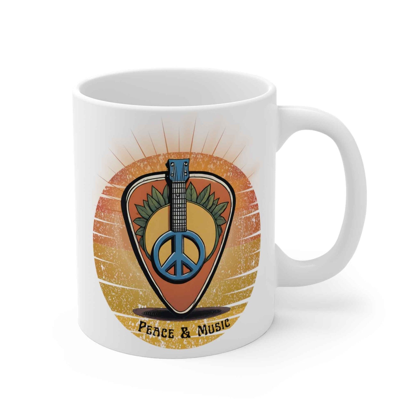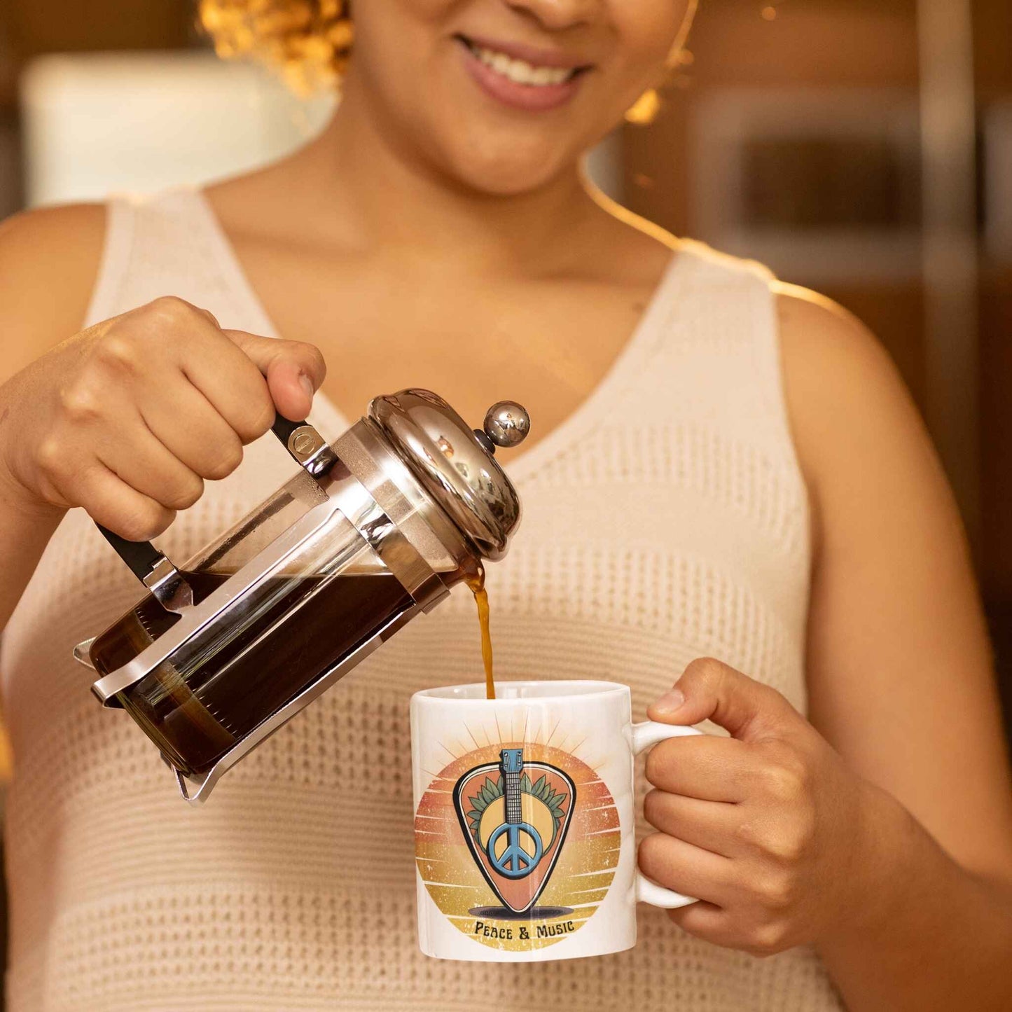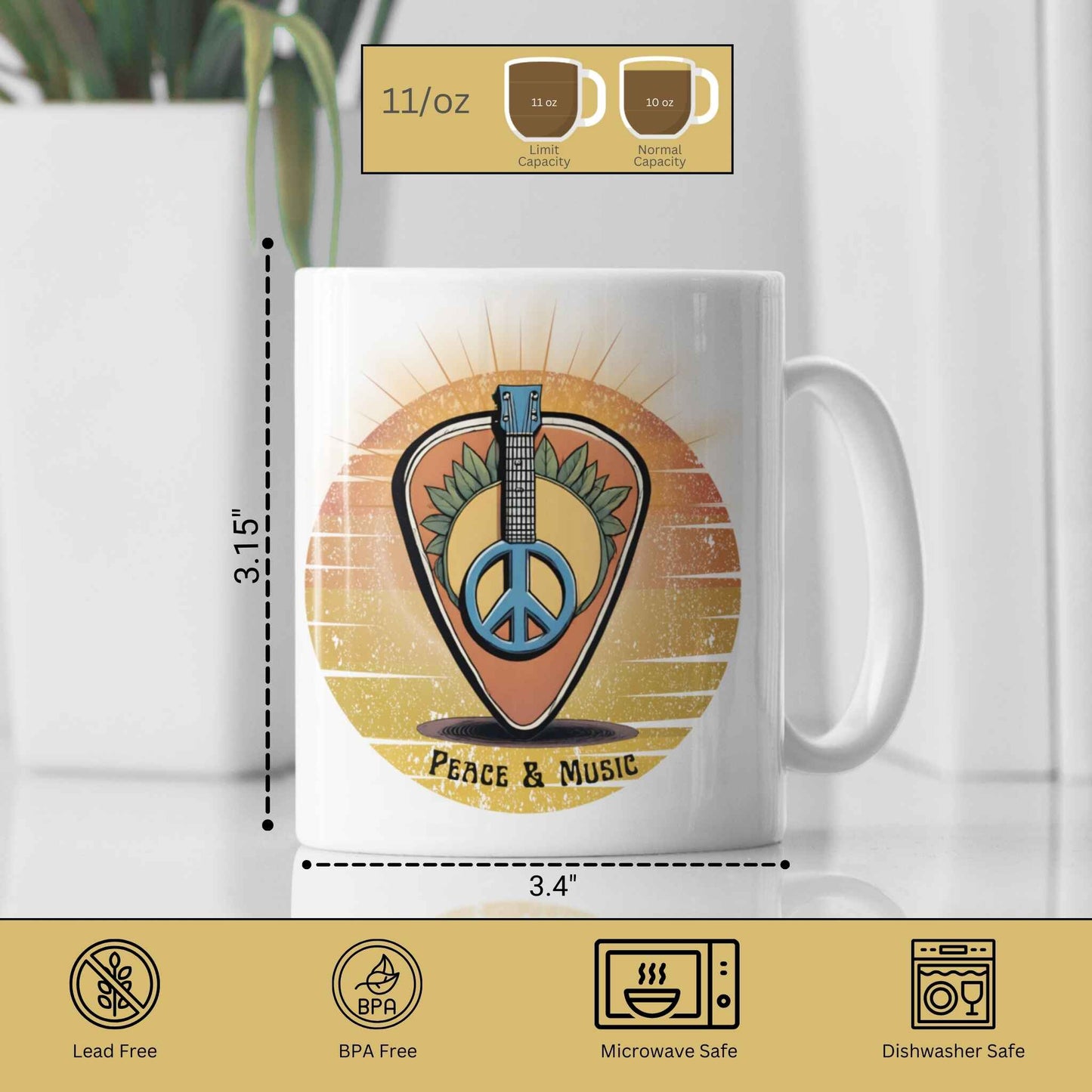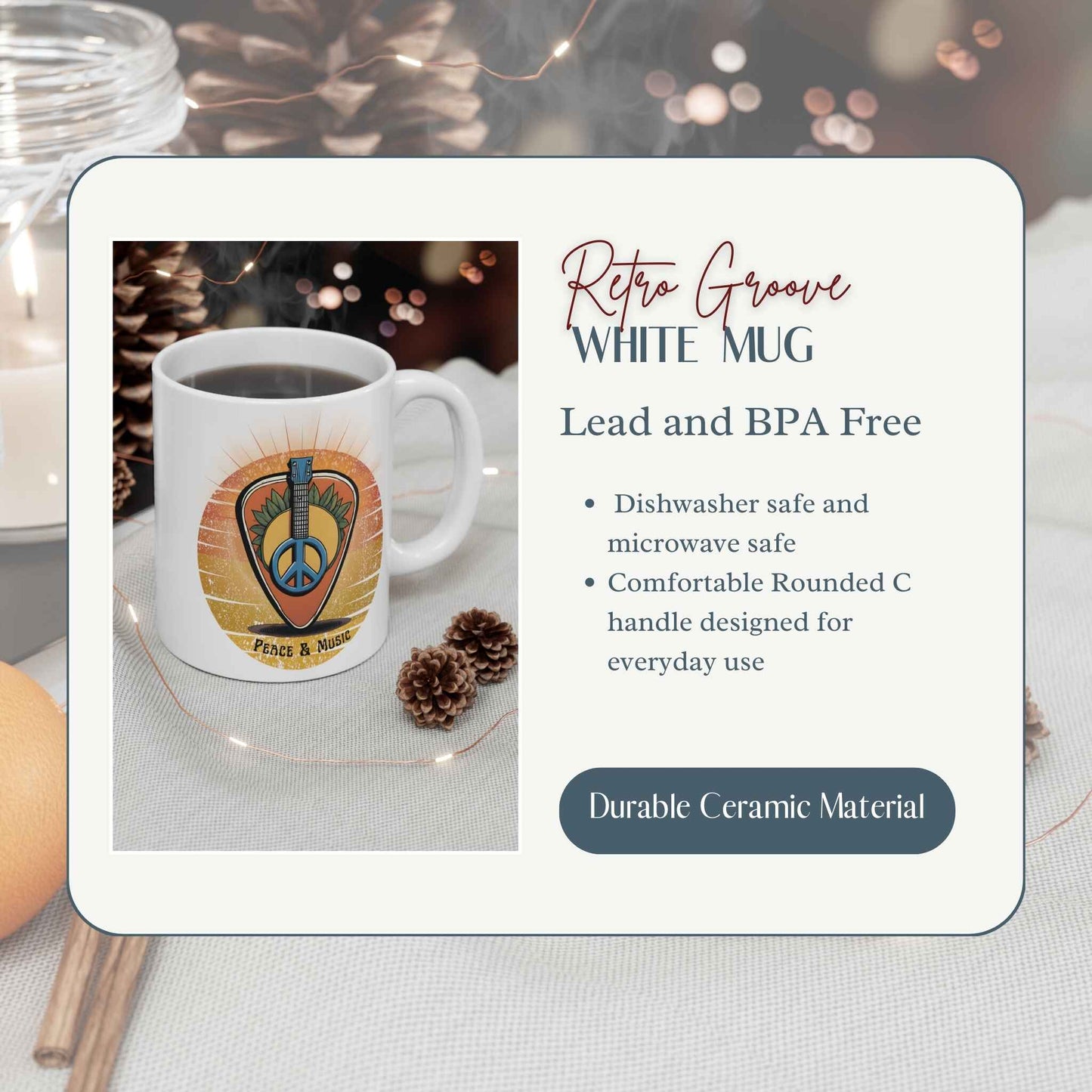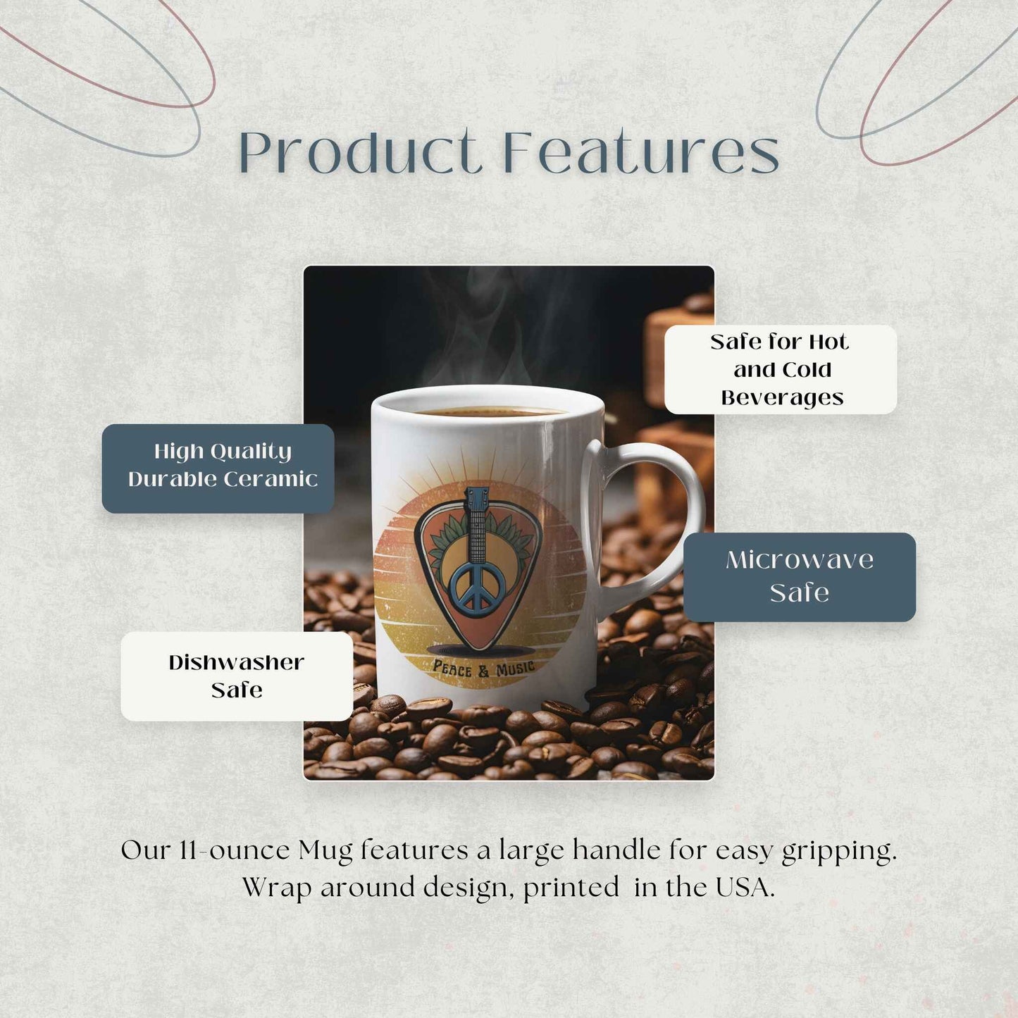 Get ready to strike a chord with the Retro Groove Mug, a unique and harmonious blend of music and coffee. This 11oz ceramic mug is a perfect gift for any guitar enthusiast, music lover, or teacher. The vibrant orange, yellow, and blue design features a retro-style guitar and pick, exuding a cool and funky vibe that's sure to start the day off right. Made from high-quality, lead-free, and BPA-free materials, this mug is not only stylish but also safe for daily use. The classic mug with rounded corners and comfortable C-handle make it easy to hold and enjoy your favorite hot beverage. Plus, it's microwave and dishwasher safe, making it a practical addition to any music lover's kitchen. The sublimation printing ensures that the design is vibrant and long-lasting, making this mug a thoughtful gift for guitarists, music teachers, and anyone who appreciates the joy of music. Whether you're looking for a unique gift for a friend or a special treat for yourself, the Retro Groove Mug is sure to hit all the right notes.