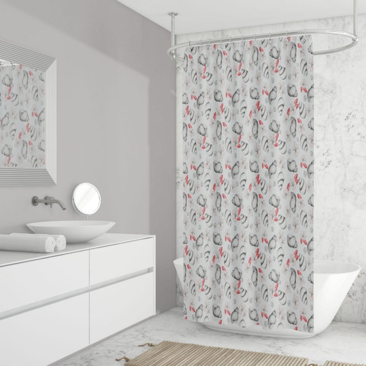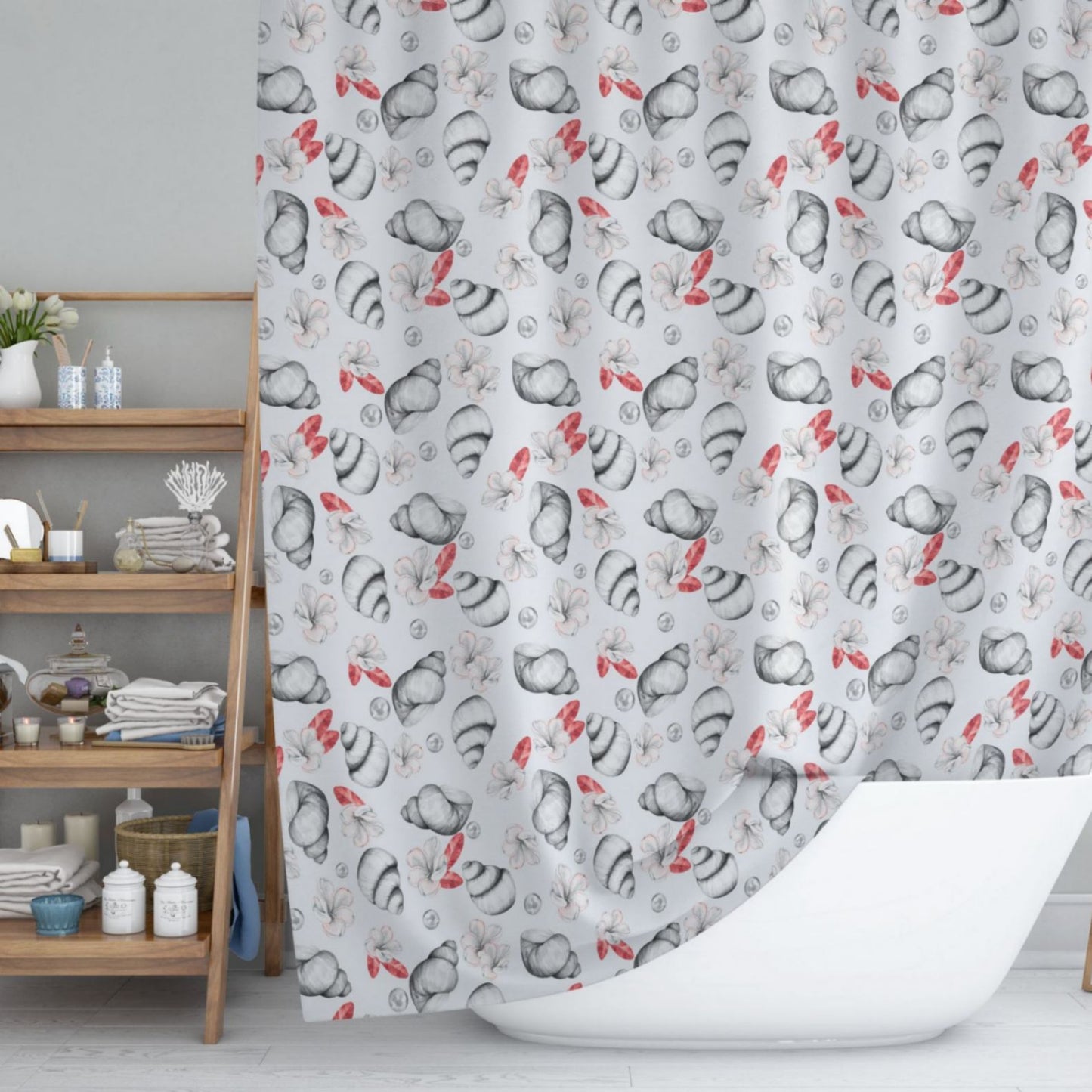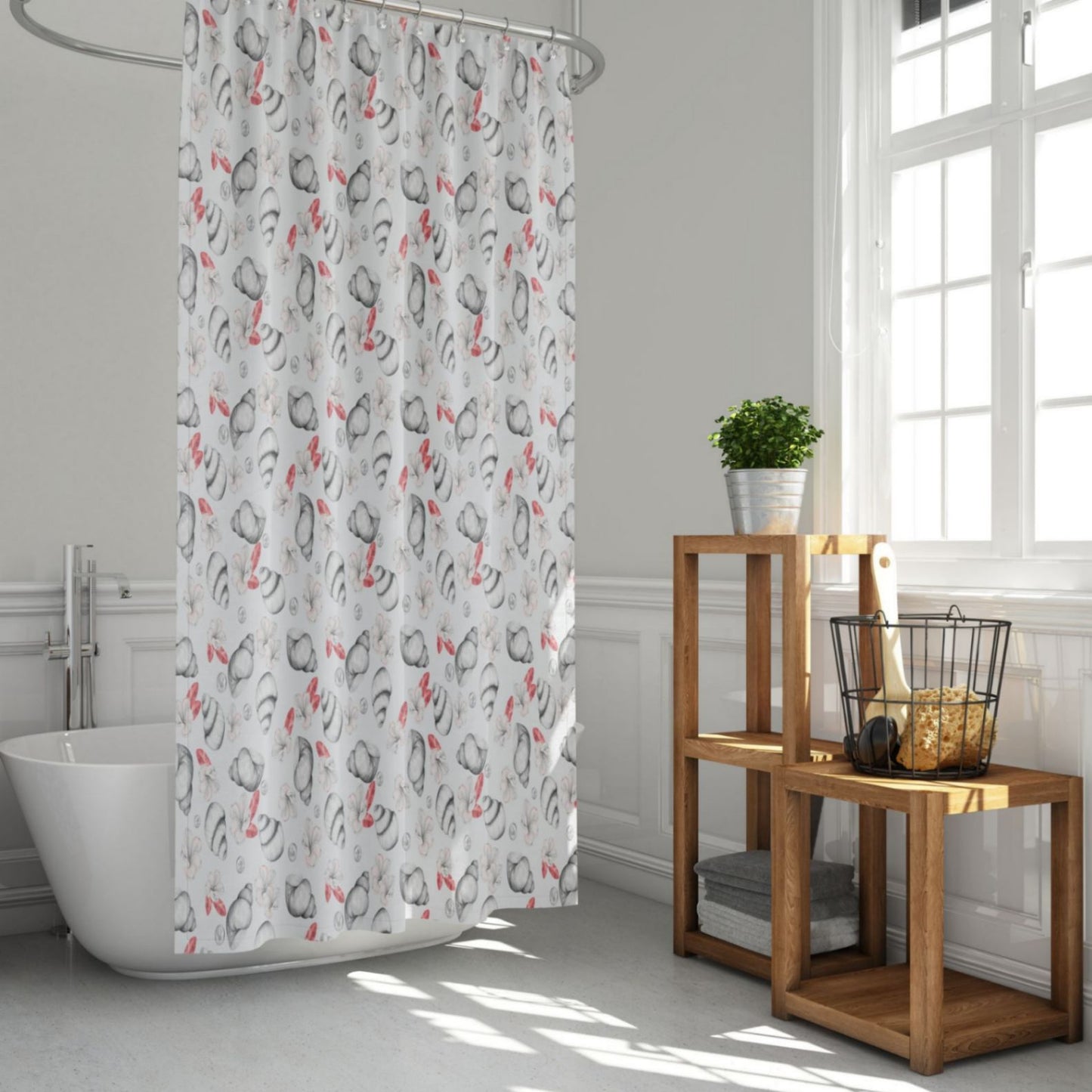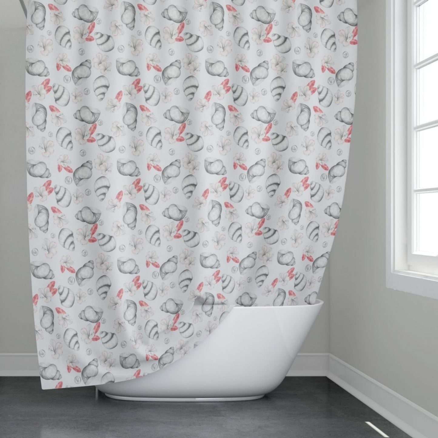 This lovely Seashells Hideaway shower curtain is a perfect accent for your seashells decor or a beachy bathroom. This beautiful shower curtain has a charming and calming pattern with seashells, flowers, and pearls—the jewel of the ocean. The beachy bathroom curtain is made of a light, soft, and breathable fabric for a tranquil shower experience. Crafted with 100% durable polyester, this shower curtain remains like new wash after wash. Decorative curtain hooks can be easily inserted into the buttonholes that have been sewed around the edges to add your own personal touch. This Seashells Hideaway Shower Curtain is perfect for a vacation home or any beach decor.