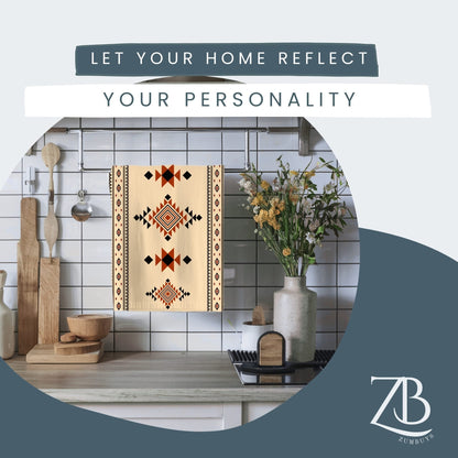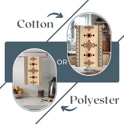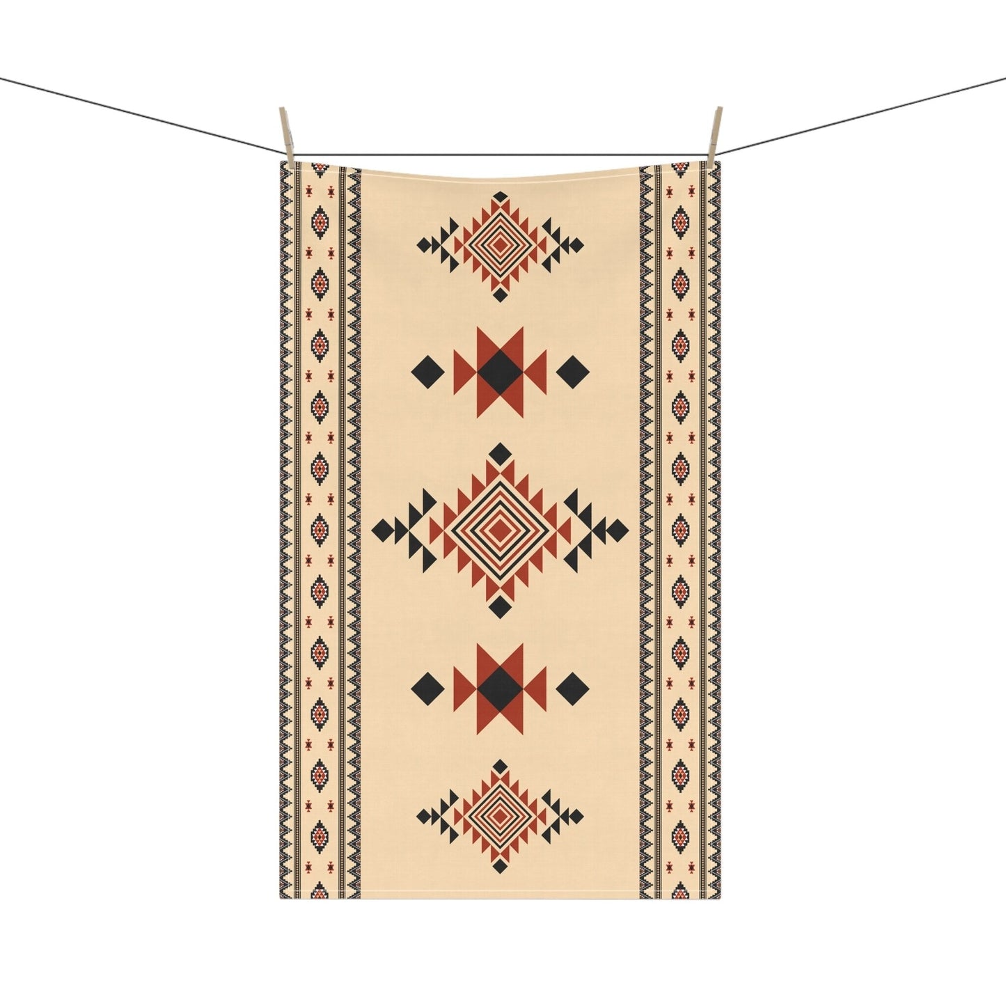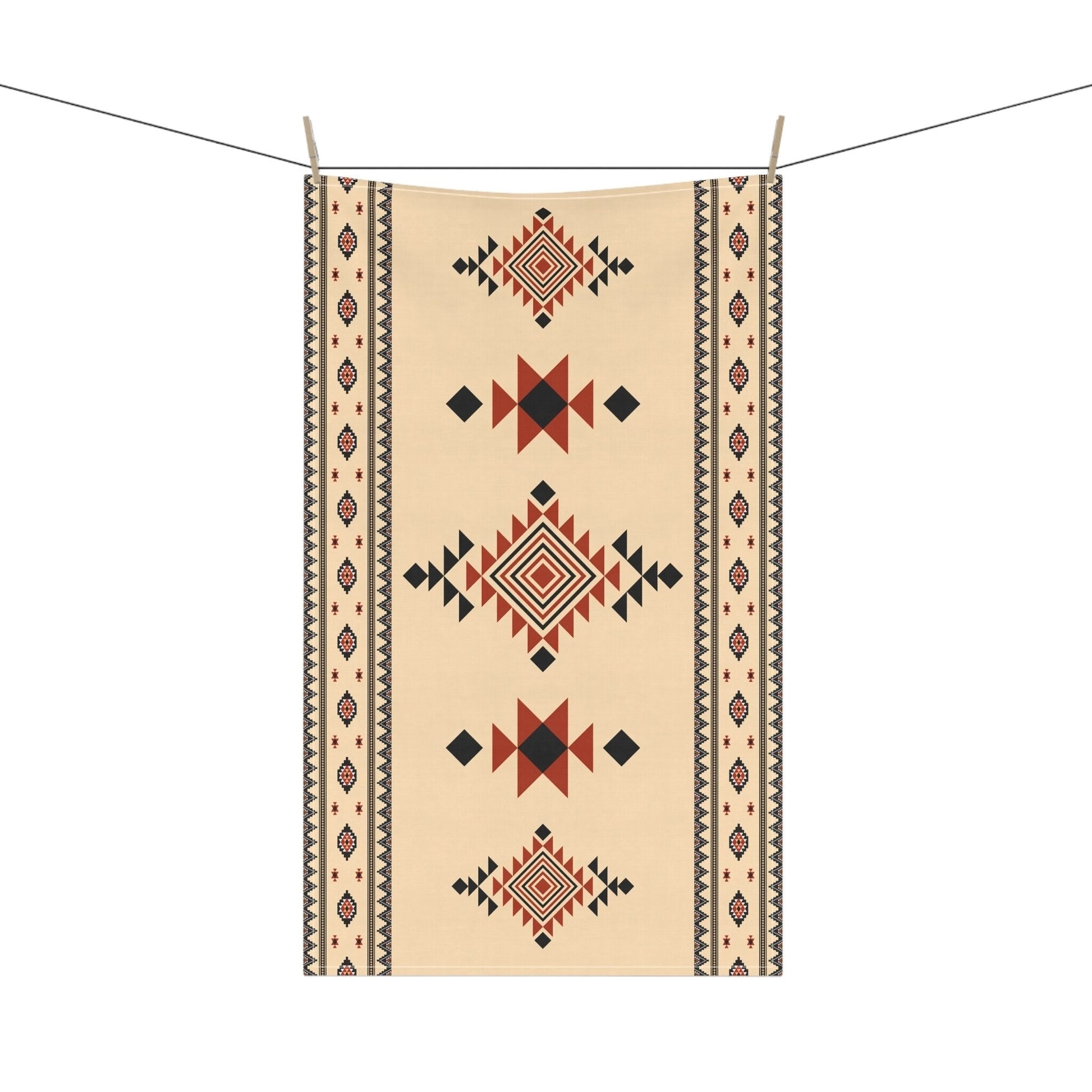 Elevate your kitchen décor with the Tierra Nova Tea Towel, featuring a striking Aztec design inspired by Native American geometric patterns. This 18x30 inch towel showcases vibrant red, beige, and black hues, bringing a bold yet rustic touch to your Southwest or boho-style kitchen. Crafted from absorbent, lightweight cotton twill or durable polyester, it combines functionality with long-lasting durability. The hemmed edges and machine-washable fabric ensure easy care, while the front-side print keeps the intricate tribal pattern vivid wash after wash. Perfect as a decorative kitchen towel or a thoughtful hostess gift, the Tierra Nova Tea Towel adds charm and style to everyday tasks.