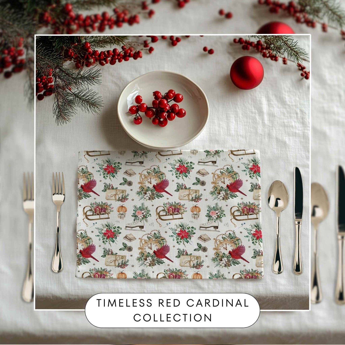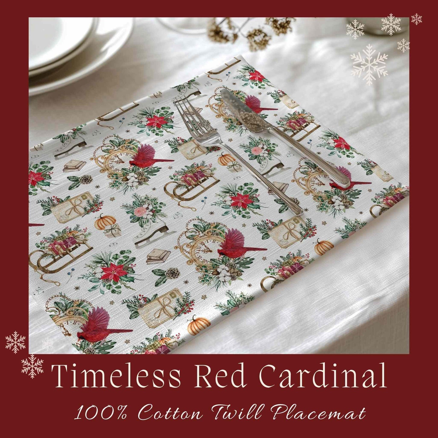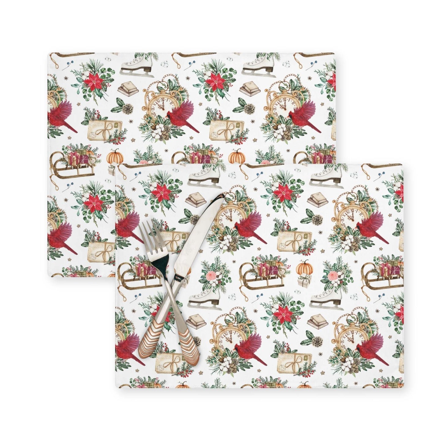 Elevate your holiday dining experience with the Timeless Red Cardinal Placemats Set of 2. Adorned with charming designs featuring vibrant red cardinals, exquisite poinsettias, and delightful seasonal elements like ice skates, an old pocket watch, a wooden sleigh filled with gifts, and nostalgic Christmas postcards, these placemats bring a touch of festive cheer to your table. Crafted from durable cotton twill, these placemats measure 18 x 14 inches and are designed to withstand the hustle and bustle of holiday gatherings. The double layer fabric ensures long-lasting quality, while the fade-resistant material keeps the vibrant colors intact wash after wash. With easy-care features, these machine-washable placemats are perfect for busy holiday hosts. Each placemat is beautifully hemmed with white seam thread, adding a polished finish that complements any holiday décor. Whether you’re hosting a cozy family dinner or a festive gathering with friends, the Timeless Red Cardinal Placemats will transform your table into a winter wonderland. Celebrate the season in style with these charming additions to your holiday table linens!