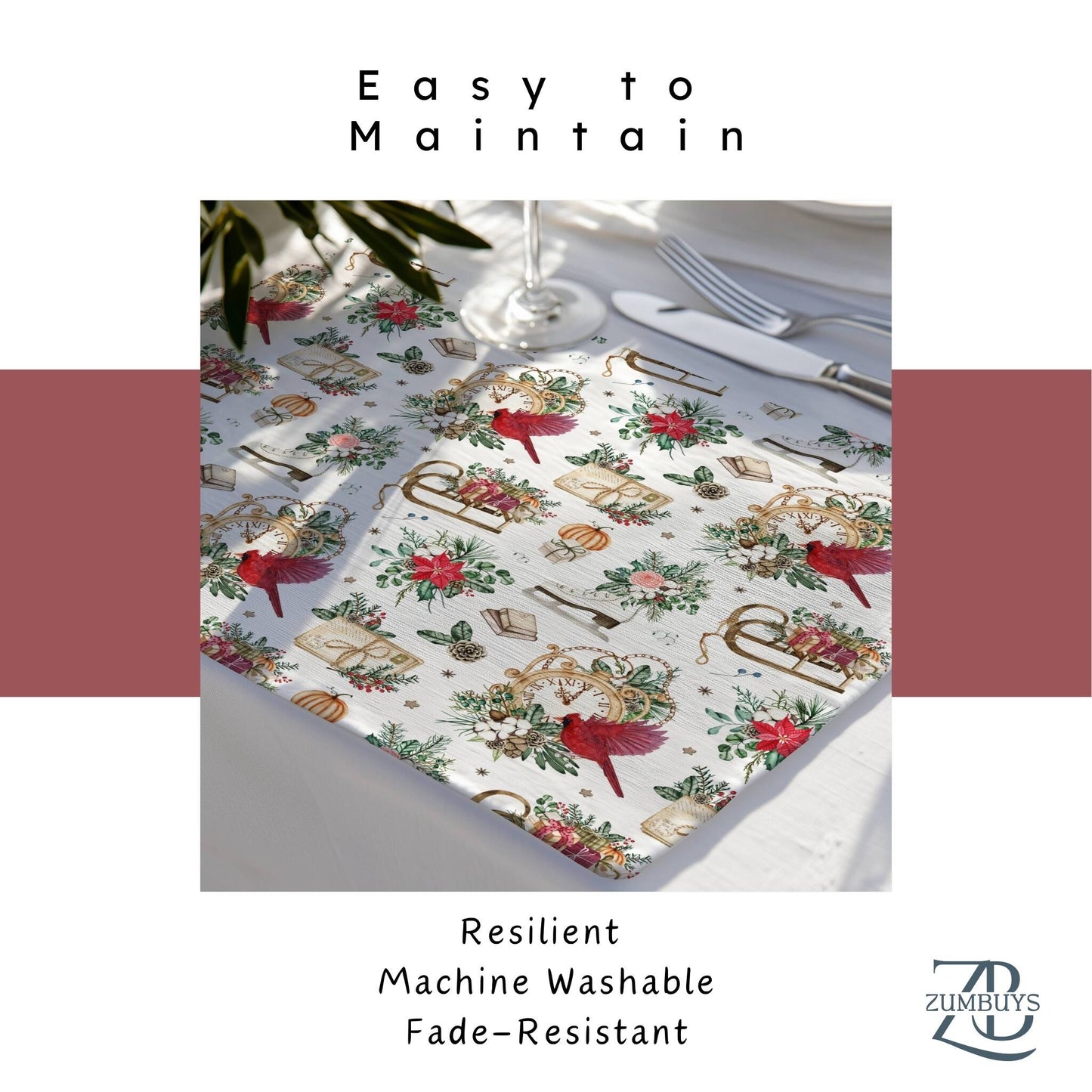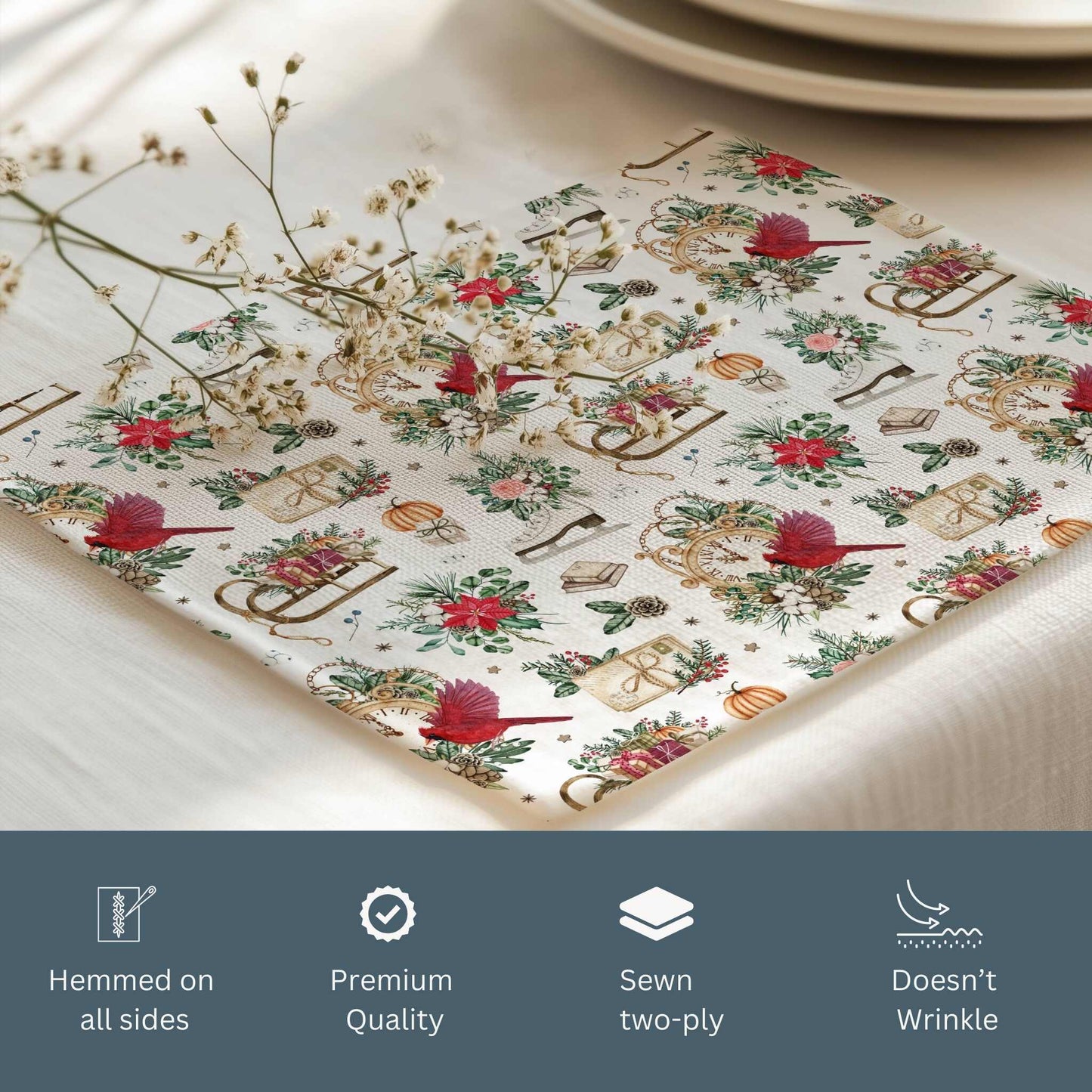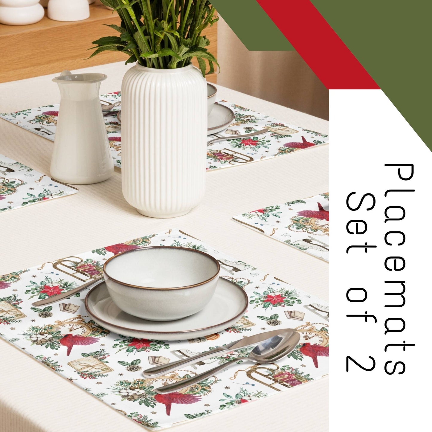 Elevate your holiday dining experience with the Timeless Red Cardinal Placemats Set of 2. Adorned with charming designs featuring vibrant red cardinals, exquisite poinsettias, and delightful seasonal elements like ice skates, an old pocket watch, a wooden sleigh filled with gifts, and nostalgic Christmas postcards, these placemats bring a touch of festive cheer to your table. Crafted from durable cotton twill, these placemats measure 18 x 14 inches and are designed to withstand the hustle and bustle of holiday gatherings. The double layer fabric ensures long-lasting quality, while the fade-resistant material keeps the vibrant colors intact wash after wash. With easy-care features, these machine-washable placemats are perfect for busy holiday hosts. Each placemat is beautifully hemmed with white seam thread, adding a polished finish that complements any holiday décor. Whether you’re hosting a cozy family dinner or a festive gathering with friends, the Timeless Red Cardinal Placemats will transform your table into a winter wonderland. Celebrate the season in style with these charming additions to your holiday table linens!